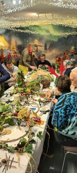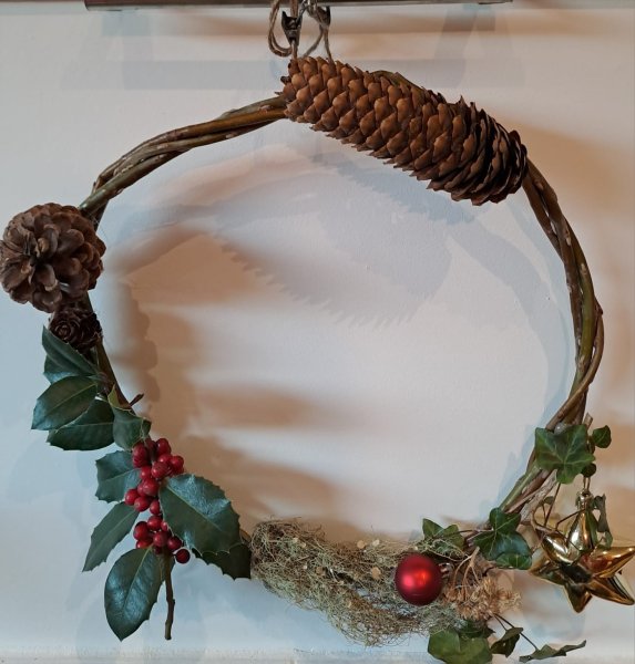 Chacun prépare et assemble les éléments (pignes, branches, boules, houx..) à fixer sur les cerceaux en osier. Chaque création est unique et personnalisée.