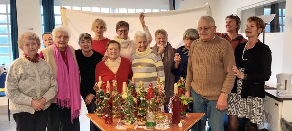 Avec nos bénéficiaires, fabrication de boules de graisse à suspendre à l'extérieur et décorations de bouteilles avec végétaux divers, pour centre de table. Chacun laisse libre court à son imagination et sa création. Gouter festif partagé.